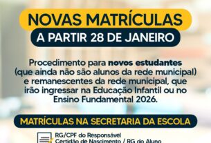 Inscrições começam em 28 de janeiro e devem ser feitas presencialmente nas escolas A Rede Municipal de Ensino de Jandaia do Sul anunciou a abertura oficial das matrículas para o ano letivo de 2026, com início a partir do dia 28 de janeiro. O processo é voltado tanto para novos alunos quanto para estudantes remanescentes […]