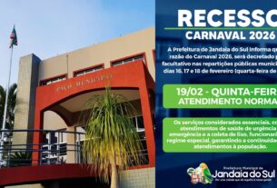 A Prefeitura informa que, em razão do Carnaval 2026, foi decretado ponto facultativo nas repartições públicas municipais nos dias 16, 17 e 18 de fevereiro. Confira como ficará o funcionamento: 16/02 (Segunda-feira): Ponto facultativo17/02 (Terça-feira): Ponto facultativo18/02 (Quarta-feira de Cinzas): Ponto facultativo Durante esse período, as repartições públicas municipais suspenderão o expediente normal, retomando o […]