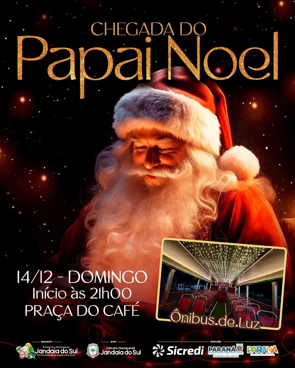 A magia do Natal toma conta de Jandaia do Sul nesta noite com a chegada do Papai Noel e do Ônibus de Luz, em um evento especial promovido pela Prefeitura Municipal. A programação acontece a partir das 21h, na tradicional Praça do Café, um dos principais pontos de encontro da cidade.