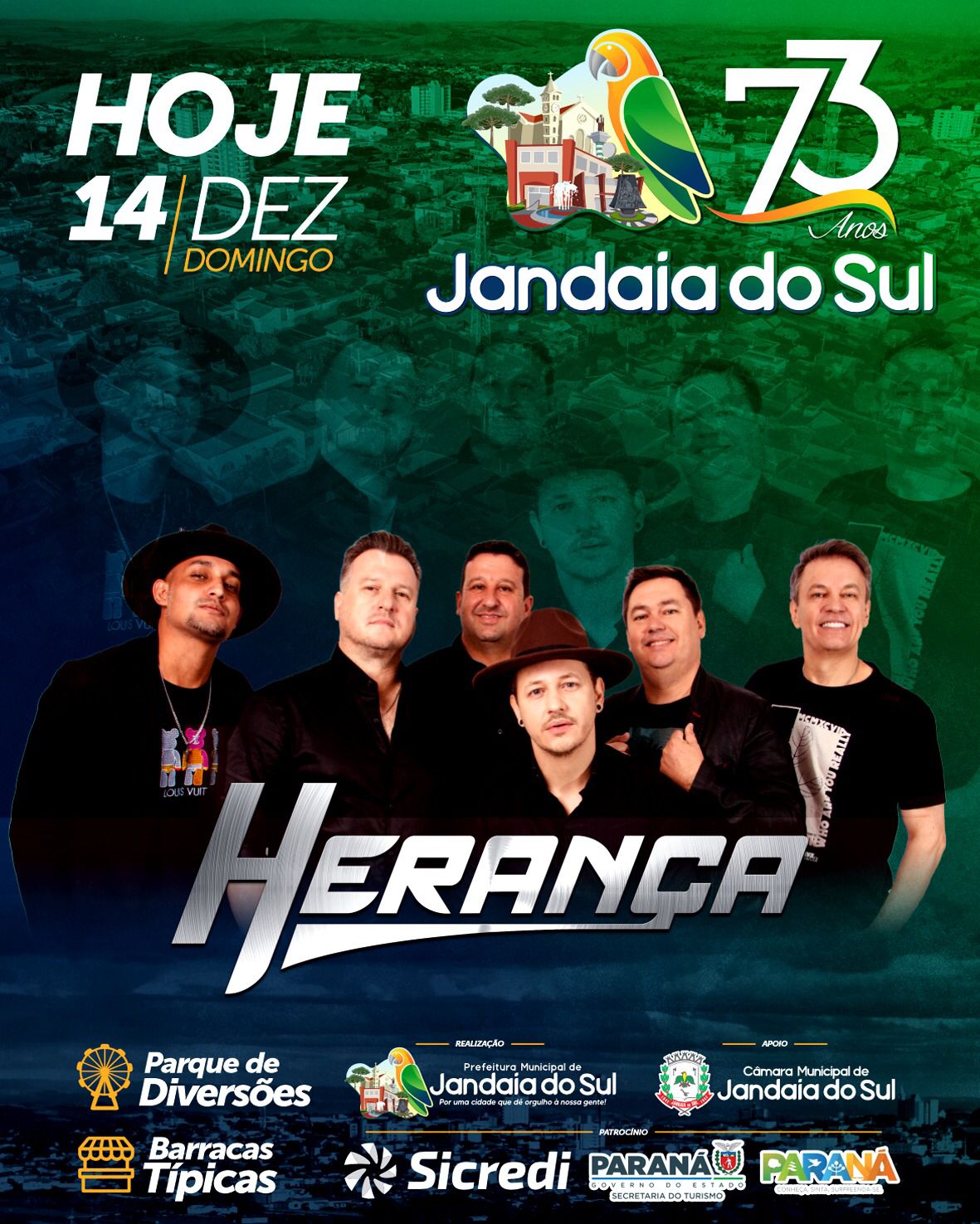 Como atração principal da noite, o público poderá prestigiar o show do Grupo Herança, que promete animar a Praça do Café com muita música, tradição e alegria, dando continuidade às celebrações do aniversário de Jandaia do Sul.