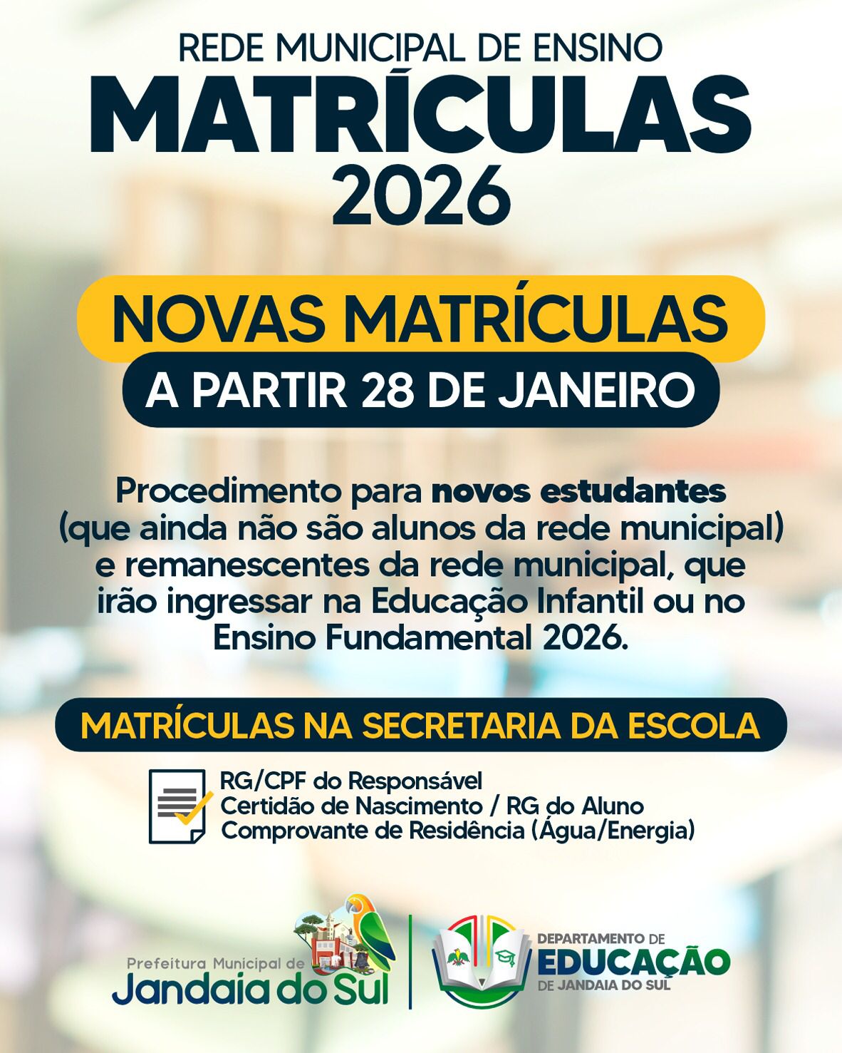 A Rede Municipal de Ensino de Jandaia do Sul anunciou a abertura oficial das matrículas para o ano letivo de 2026, com início a partir do dia 28 de janeiro. O processo é voltado tanto para novos alunos quanto para estudantes remanescentes que irão ingressar na Educação Infantil ou no Ensino Fundamental.