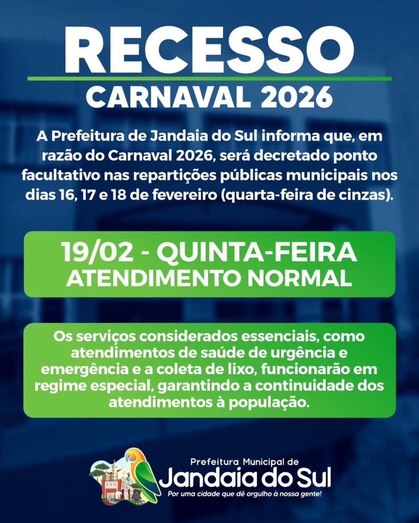 Durante esse período, as repartições públicas municipais suspenderão o expediente normal, retomando o atendimento ao público na quinta-feira, dia 19 de fevereiro, em Jandaia do Sul.